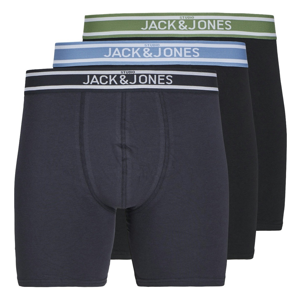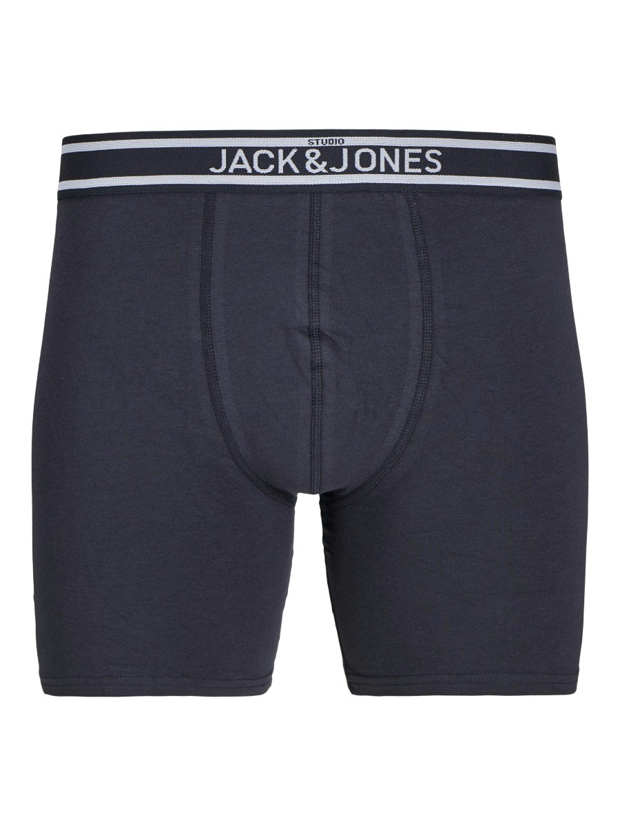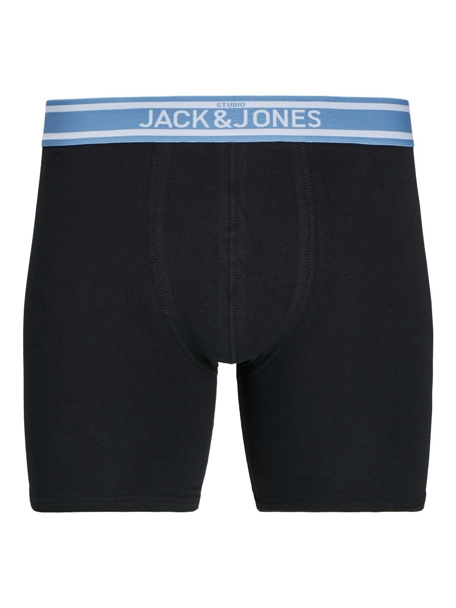 De Jack&Jones Heren Jacteddy Boxer Briefs 3-Pack zijn nauwsluitend en bedekken het binnenbeen volledig. Op deze manier blijft alles goed op zijn plek zitten. Ze zijn een paar centimeter langer dan normale boxers. Ze zijn gemaakt van een jersey materiaal, dit is zacht en rekbaar en zorgt voor comfort. In deze 3 pack ontvang je 2 zwarte boxers en 1 blauwe, met elk een andere kleur tailleband.