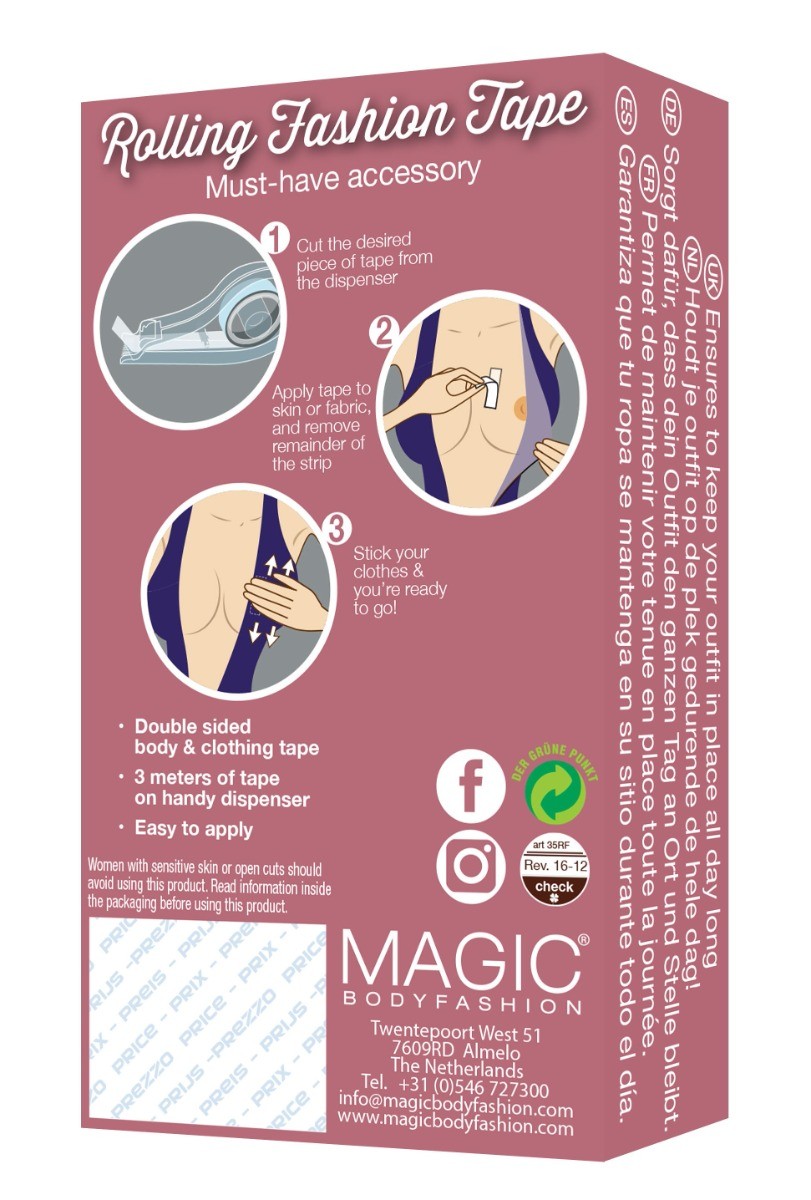 Met de Rolling Fashion Tape van MAGIC Bodyfashion zorg je ervoor dat jouw outfit er perfect uitziet. De zelfklevende dubbelzijdige tape houdt jouw kelding op zijn plaats en is gemakkelijk aan te brengen op de huid of stof. De tape is ideaal om kledingstukken te verstevigen of te verbergen. Je kunt zelf de lengte bepalen door een stuk van de rol af te knippen. Daarnaast blijft de Rolling Fashion Tape de hele dag goed zitten.
