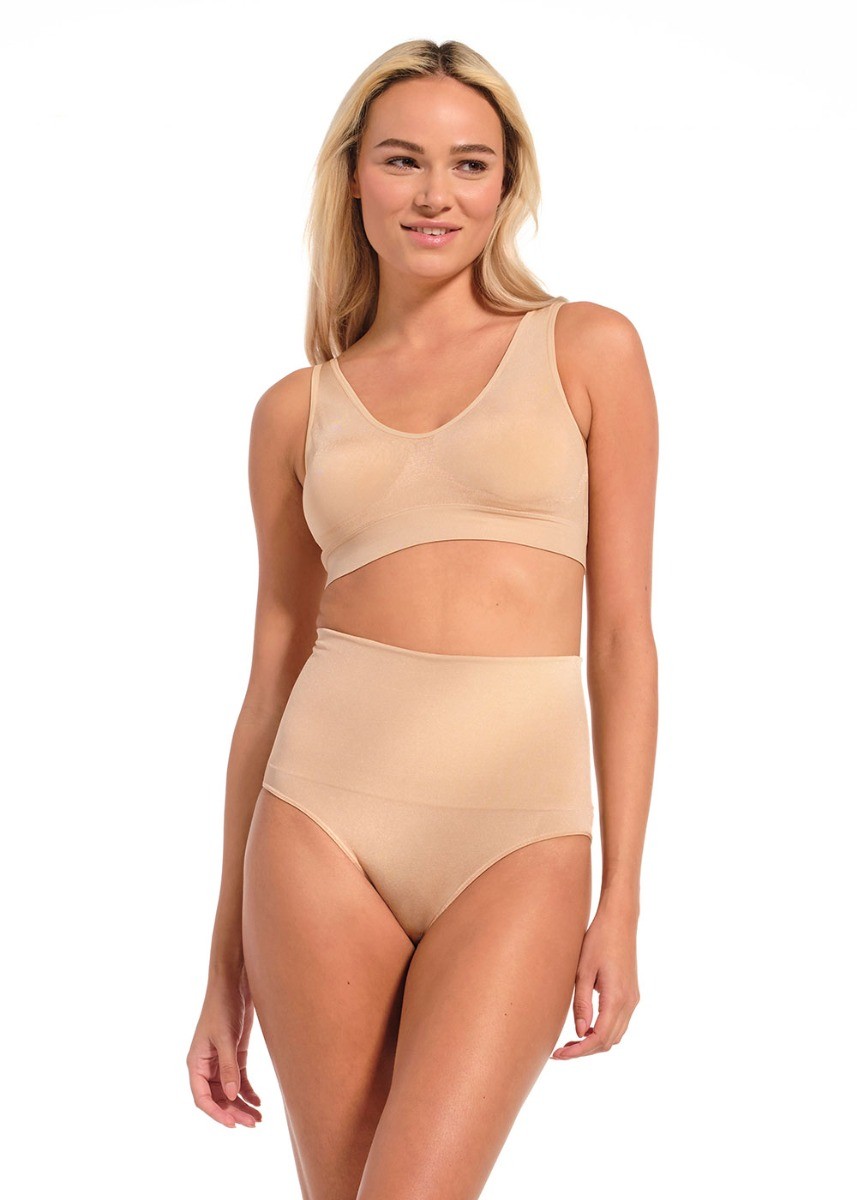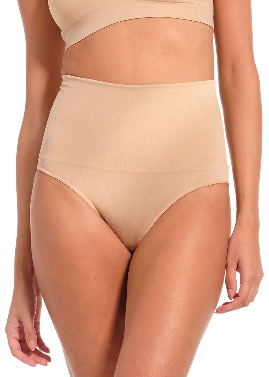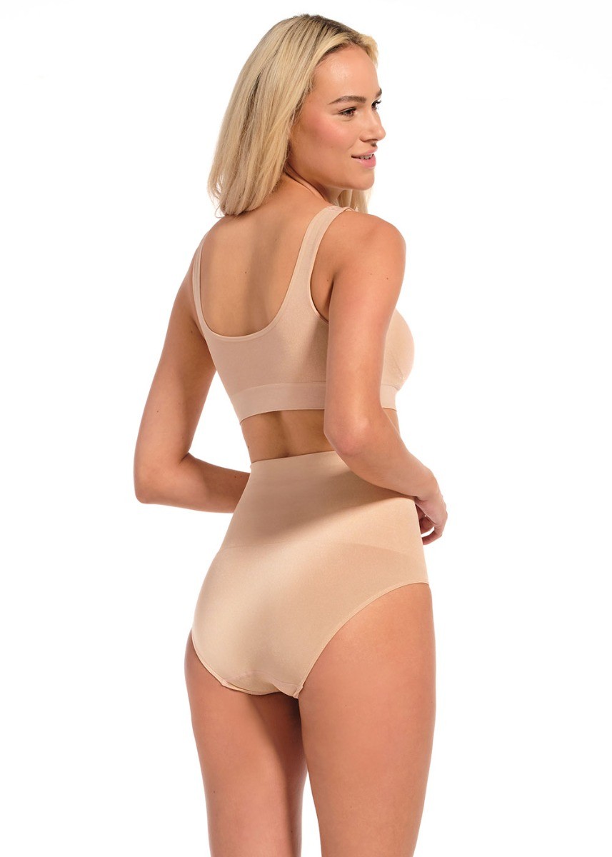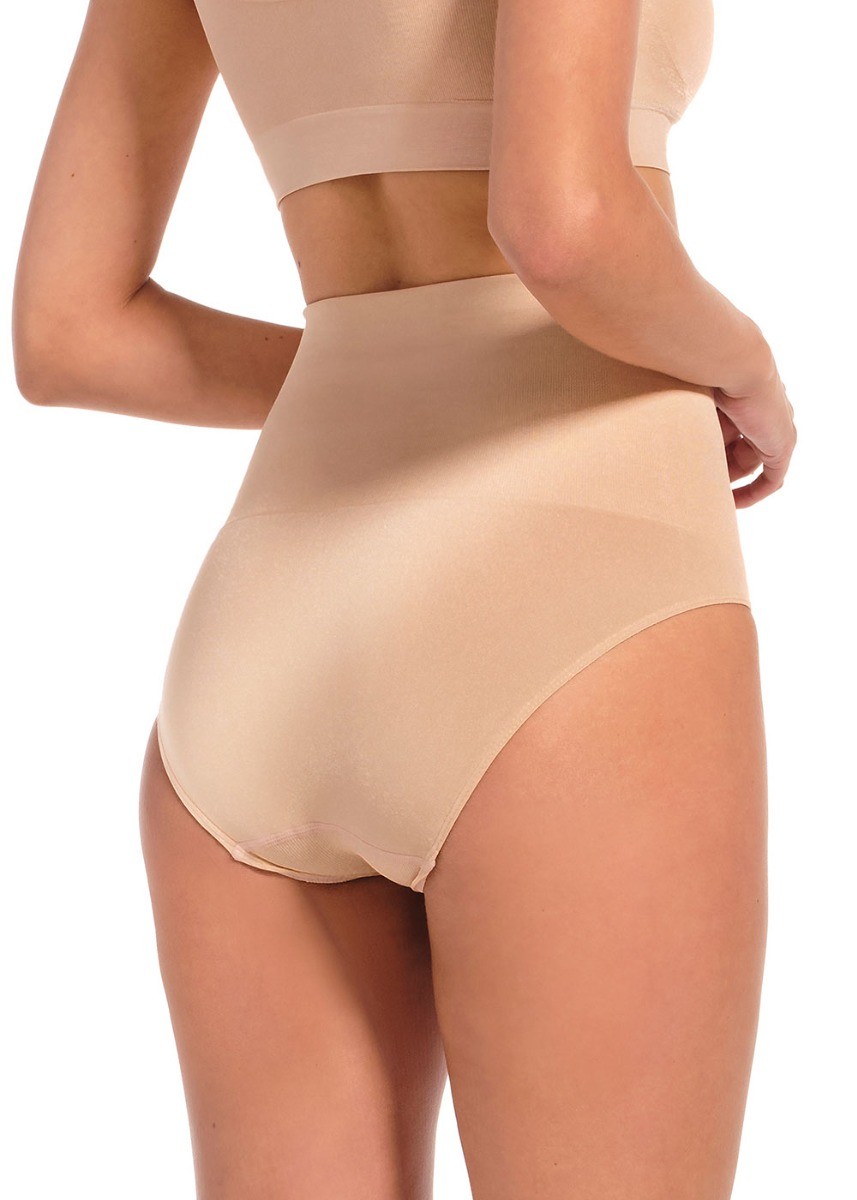Deze beige shaper slip met hoge taille en subtiele shimmer biedt lichte shaping en een gladmakend effect voor een gestroomlijnd silhouet. Het zachte, rekbare materiaal sluit comfortabel aan en beweegt soepel mee, ideaal voor dagelijks gebruik onder iedere outfit.