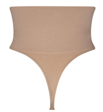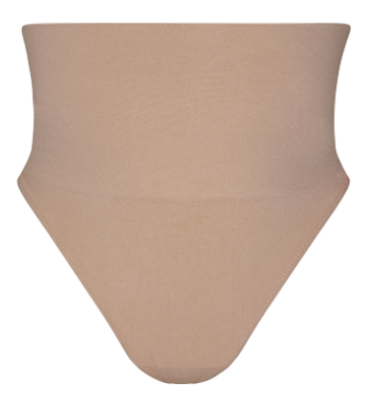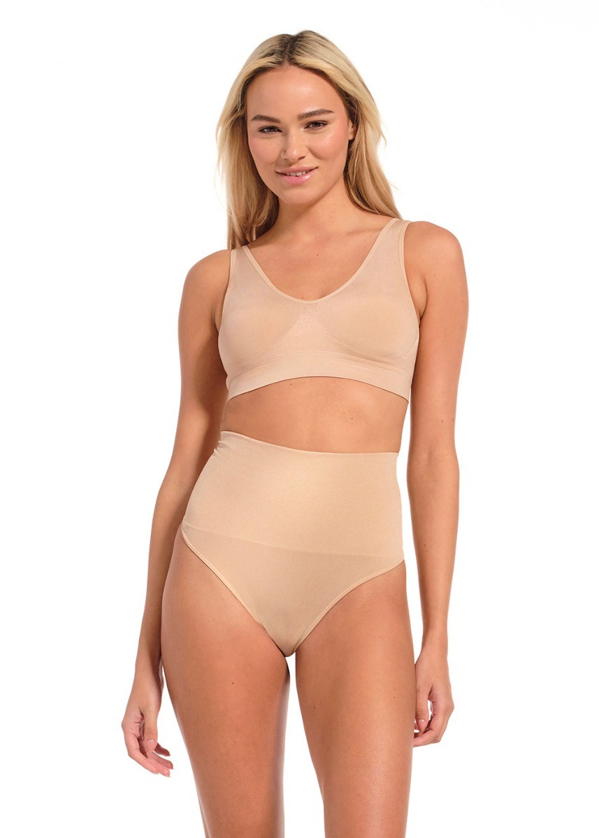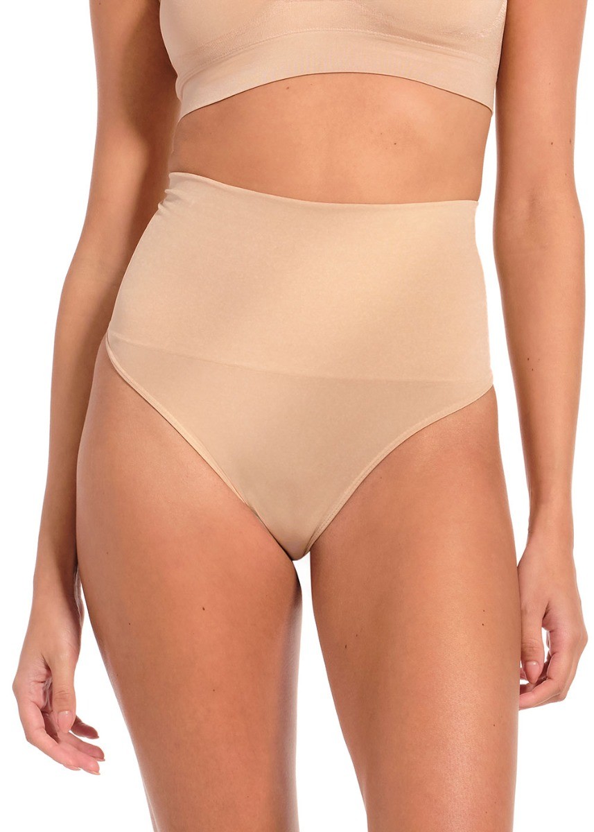 Deze beige thong met hoge taille biedt een gladmakend effect en een subtiele shimmer voor een gestroomlijnd silhouet. Het zachte, rekbare materiaal sluit comfortabel aan en blijft onzichtbaar onder kleding.