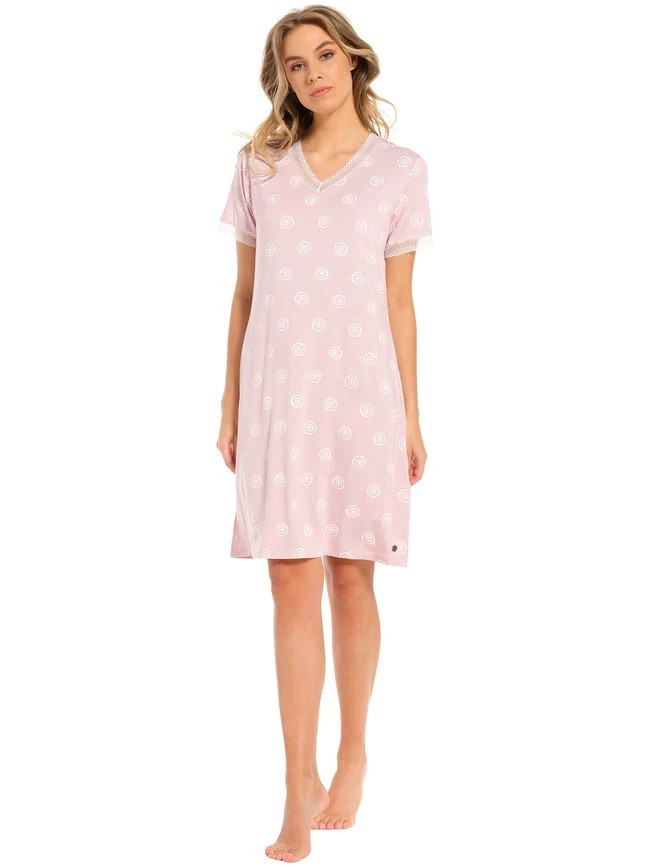 Dit nachthemd van pastunette met korte mouwen heeft een V-hals en valt tot net boven de knie. De roze kleur van het nachthemd in combinatie met de print zorgt voor een vrolijk effect. Het nachthemd is 95 cm lang.
