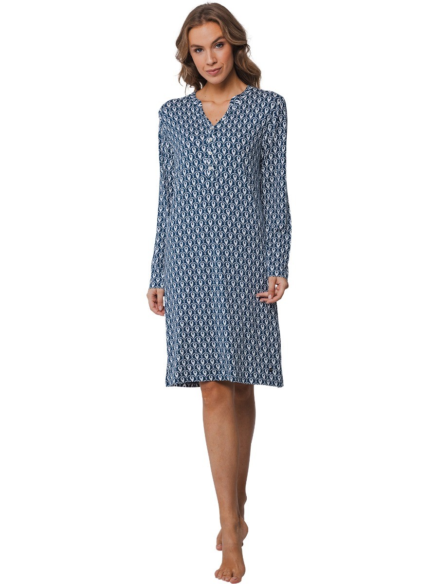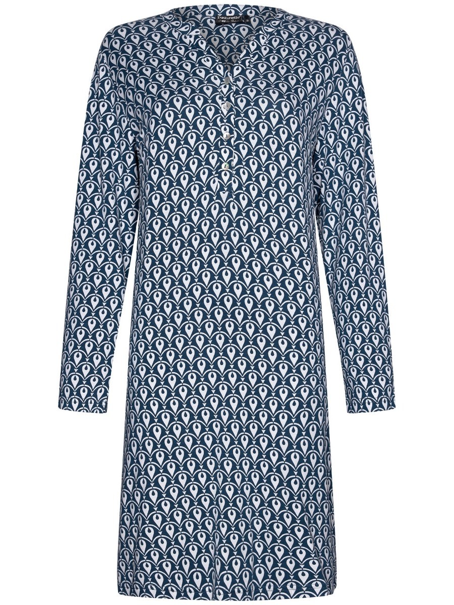 In deze nachtjurk van Pastunette Premium ga jij ongetwijfeld veel comfortabele nachten tegemoet. De nachtjurk heeft een donkerblauwe kleur met een mooie print. De nachtjurk heeft een lange mouw en een v-hals met knoopjes. De zachte en warme stof zorgt voor een comfortabel gevoel op je huid. De nachtjurk heeft een lengte van 95 cm.