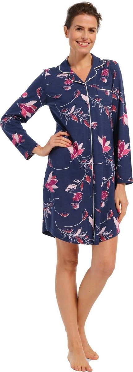 Pastunette Dames Nachthemd Dark Blue met lange mouwen, doorknoopsluiting, reverskraag en borstzakje.