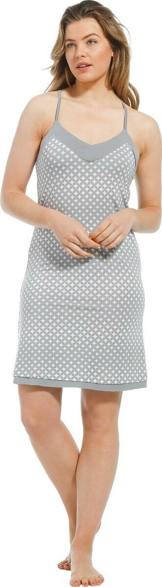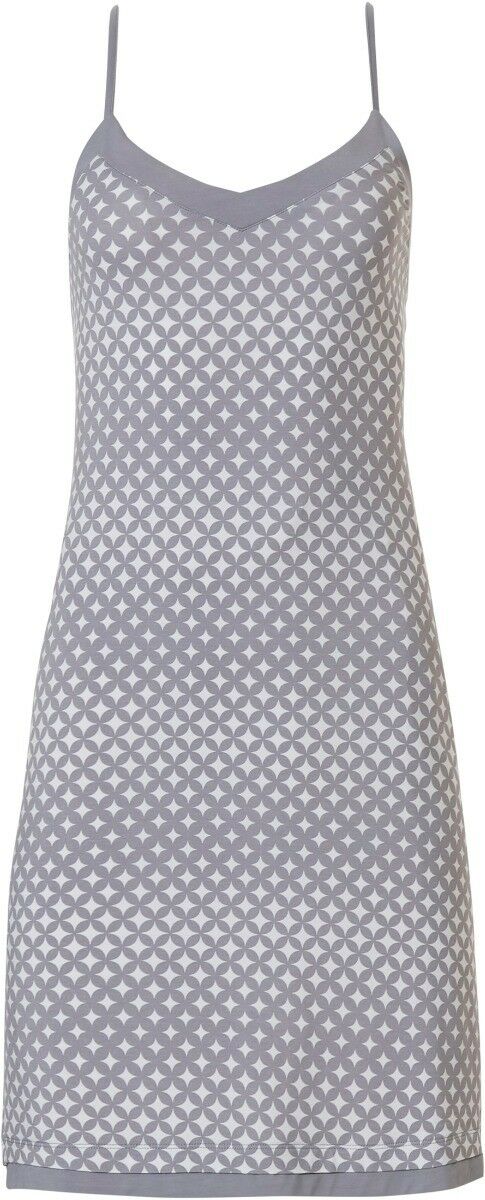 In dit nachthemd van Pastunette ga jij ongetwijfeld veel comfortabele nachten tegemoet. Het nachthemd met grijs-witte print heeft spaghettibandjes en een v-hals met effen, grijze boord. De zachte, gladde stof ademt goed en zorgt voor een fijn gevoel op de huid. Het nachthemd heeft een lengte van 90 cm.