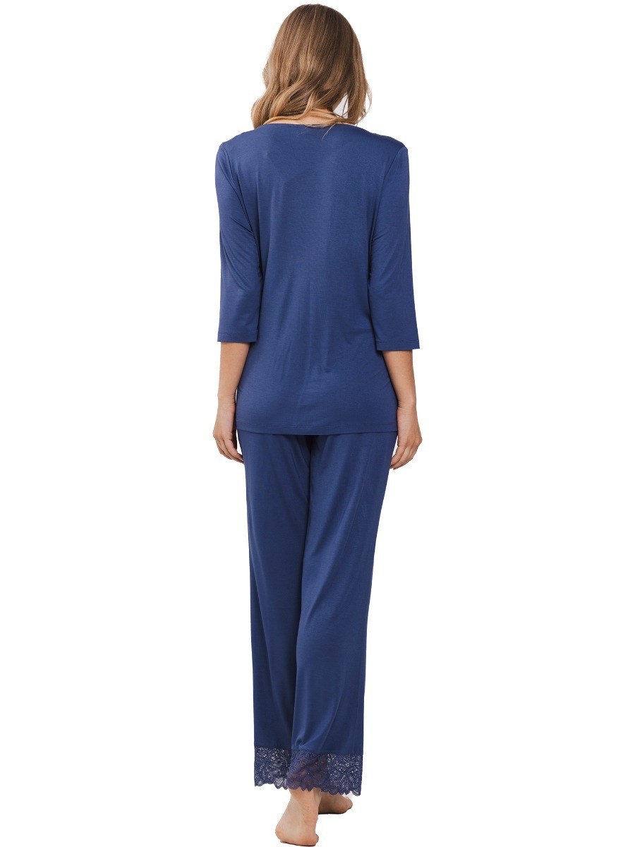 Met deze donkerblauwe pyjama van Pastunette Premium slaap je niet alleen lekker, maar zie je er ook nog eens uit om door een ringetje te halen! De top met V-hals heeft een driekwart mouw. De mooie donkerblauwe pyjamabroek matcht perfect met de donkerblauwe kleur van de top. Een mooi detail is de prachtige kantwerking aan de hals en de uiteinden van de pyjamabroek. De pyjamaset is gemaakt van 95% ecovero viscose en 5% elastaan. De zachte, gladde stof ademt goed en zorgt voor een comfortabel gevoel op je huid.