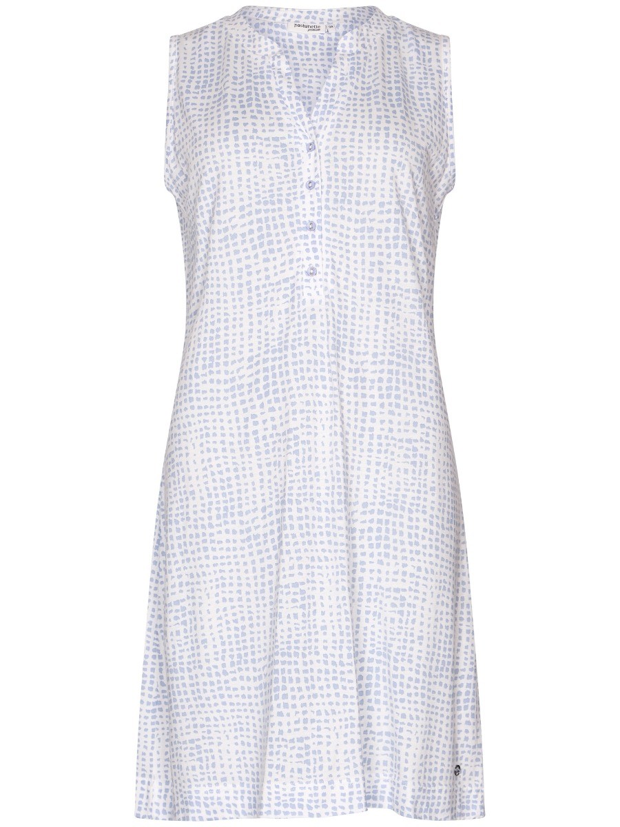 In deze nachtjurk van Pastunette Premium ga jij ongetwijfeld veel comfortabele nachten tegemoet. De nachtjurk heeft een lichtblauwe kleur met een mooie print. Het nachthemd is mouwloos, heeft een V-hals met een opstaand boordje en een knoopsluiting. De comfortabele stof is gemaakt van 50% katoen en 50% modal. De stof voelt heerlijk zacht en glad aan en is gemakkelijk in onderhoud. Het kan makkelijk vocht absorberen wat je nachtrust zeer ten goede komt. Bovendien is katoen een goede warmte-isolatie. De nachtjurk heeft een lengte van 95 cm.