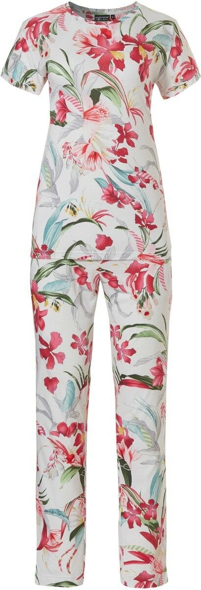 Met deze pyjama van Pastunette Deluxe reis je in je dromen af naar een tropisch eiland. De fleurige bloemenprint tovert dan ook meteen een lach op je gezicht! De pyjama bestaat uit een shirt met korte mouwen en een ronde hals en een lange pyjamabroek.
