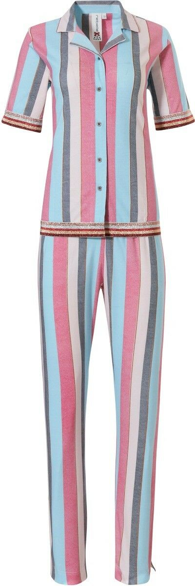 Rebelle Dames Pyjama met lange broek, korte mouw, kraagje en doorknoop sluiting.