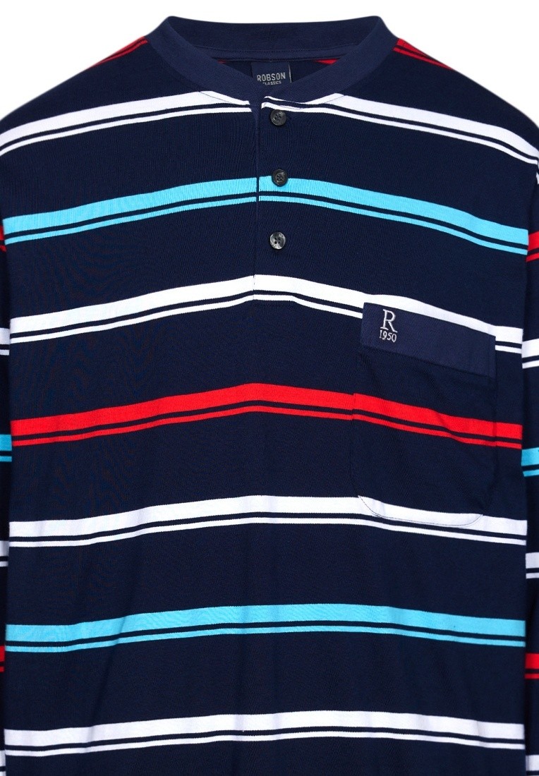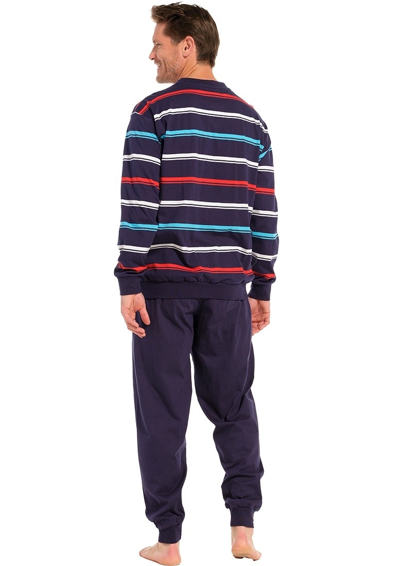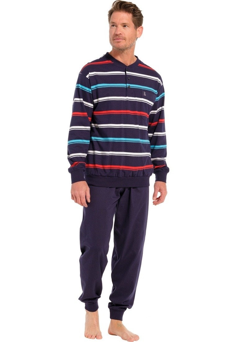 In deze Pyjama van Robson Heren ga jij ongetwijfeld veel comfortabele nachten tegemoet. De pyjama heeft een donkerblauwe kleur met een leuke strepen print. Het shirt heeft lange mouwen, v-hals en de lange donkerblauwe broek heeft een elastische tailleband. De pyjama is gemaakt van 100% katoen. Deze fijne pyjama zorgt voor comfort de hele nacht door!