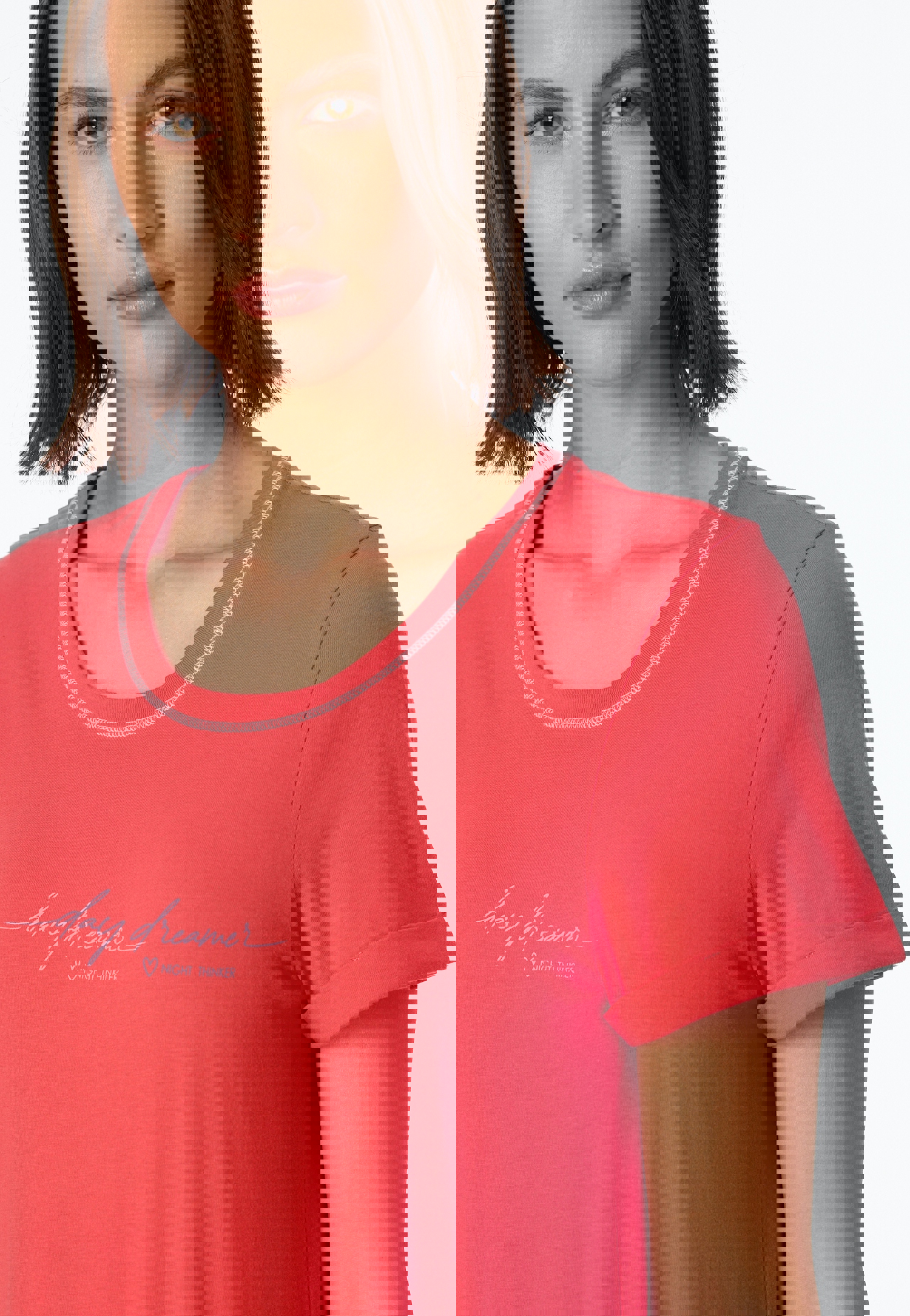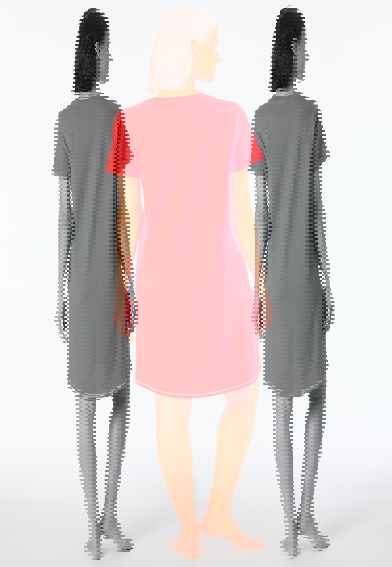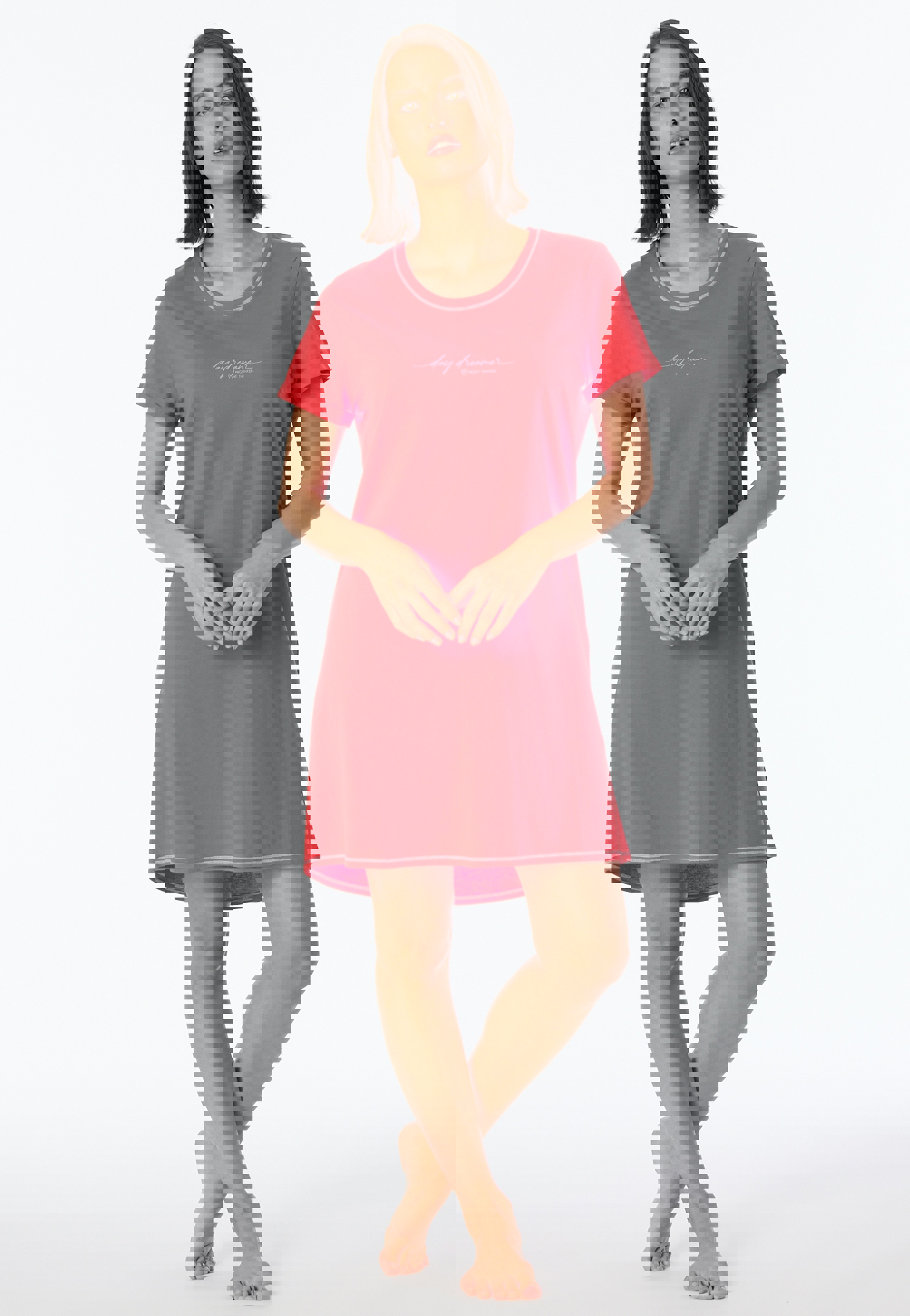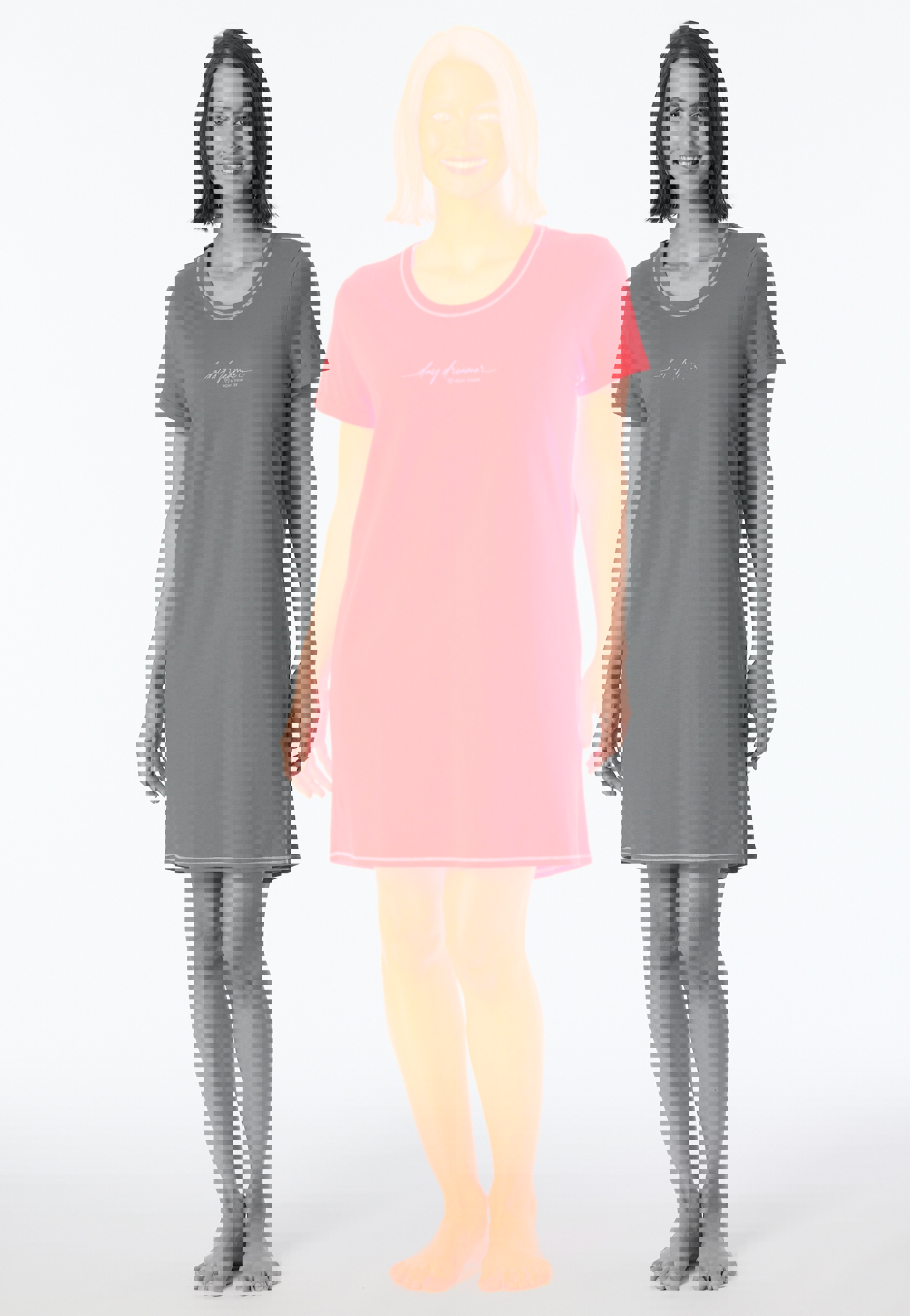 Dit Schiesser Dames Nachthemd, met korte mouwen en een statementprint, heeft een ronde hals. Het nachthemd heeft korte, nonchalant gevouwen manchetten en een ronde zoom, met iets lengte aan de achterkant. De totale lengte is 95 cm.