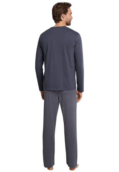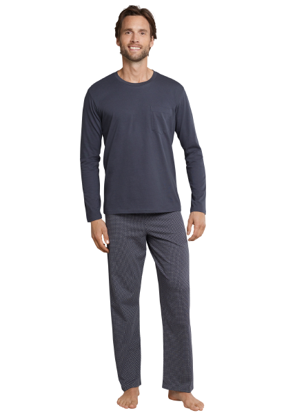 Deze grijze pyjama met lange broek heeft een stijlvolle look en is van 100% zacht katoen. Het bovenstuk heeft een ronde hals en borstzakje. De lange broek heeft een all-overprint van witte cirkeltjes, die discrete details biedt door de lintsluiting aan de band en de achterzak. De lichte en luchtige single jersey geeft comfort en garandeert aangename nachten van uitstekende SCHIESSER-kwaliteit!