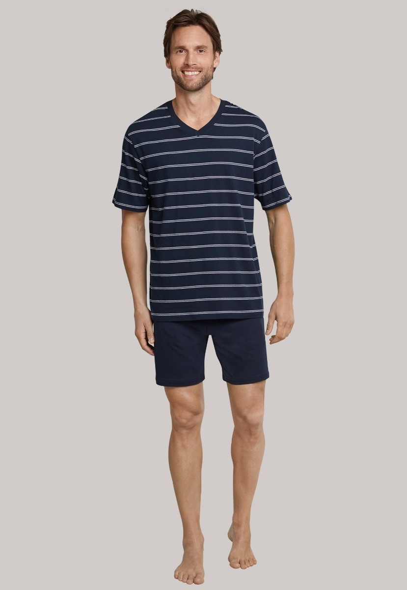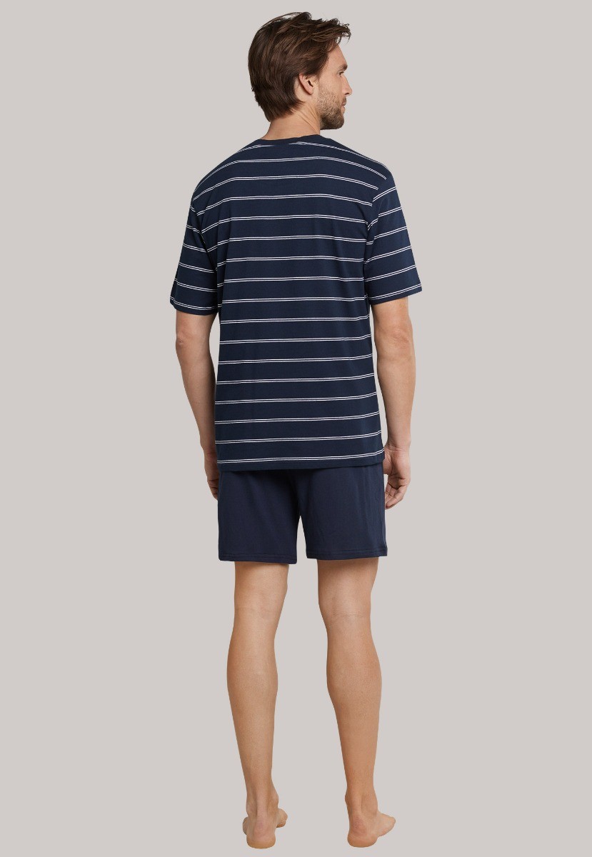 De donkerblauwe pyjama met korte broek is gemaakt van 100% zacht katoen. De witte, gebreide dwarsstrepen en de V-hals met donkerblauw accent geven een sportieve look. Dze wordt perfect afgerond door de korte, donkerblauwe broek met lintsluiting aan de band en achterzak. Een ongecompliceerde, comfortabele pyjama van uitstekende SCHIESSER-kwaliteit!